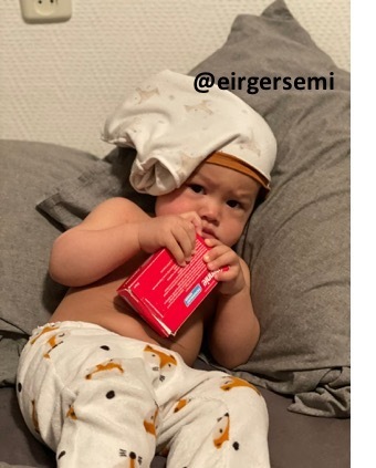 Gambar 1. Seorang bayi laki-laki tampat tidak senang saat memegang kardus obat.
